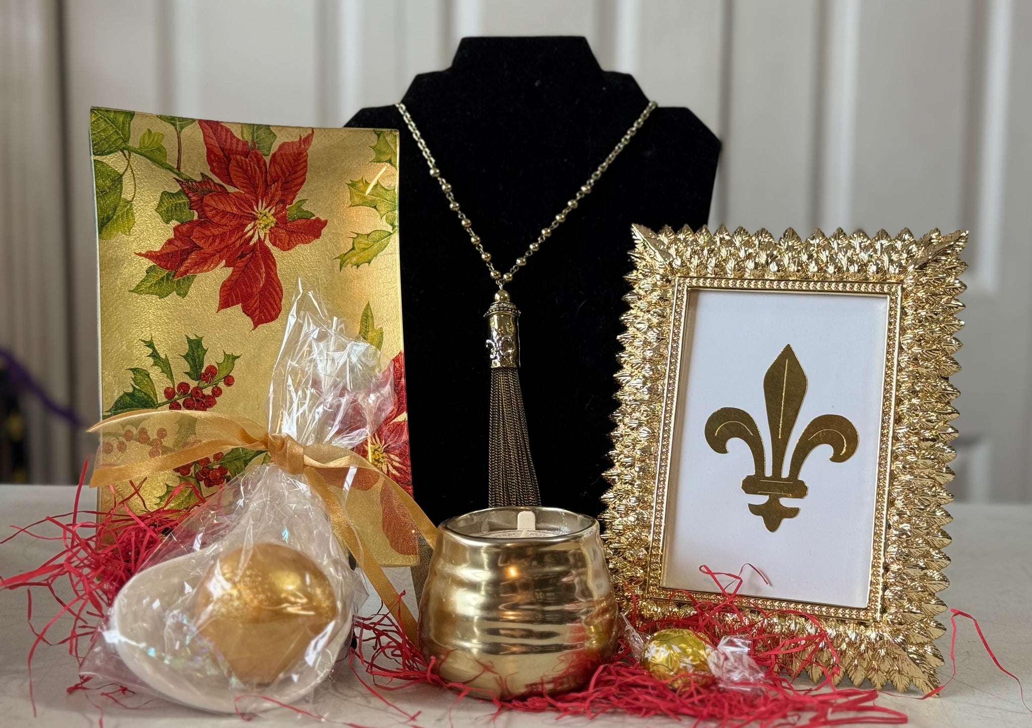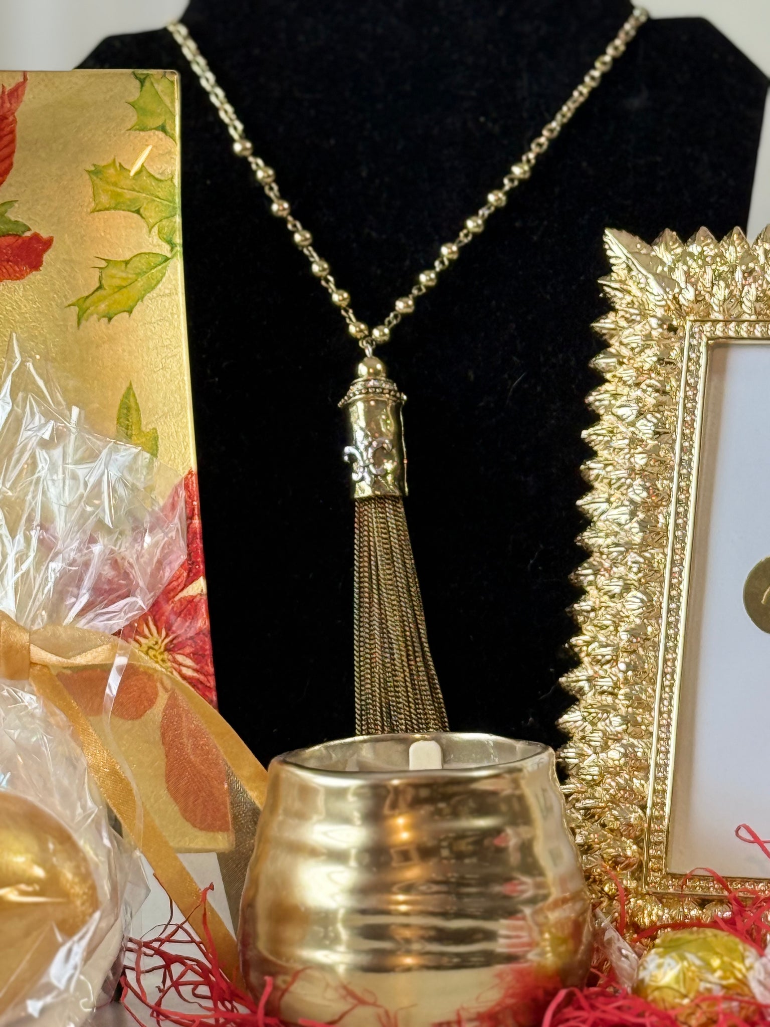 A beautifully curated collection of festive luxury, this set pairs rich gold tones with classic holiday charm. It features a chic gold tassel necklace, a stunning gold-accented fleur-de-lis frame, and a metallic gold candle for a warm holiday glow. A poinsettia-themed tray and a beautifully wrapped bath bomb on an oyster shell add seasonal refinement, while touches of red filler bring the entire presentation to life. Perfect for anyone who loves timeless style with a holiday sparkle.