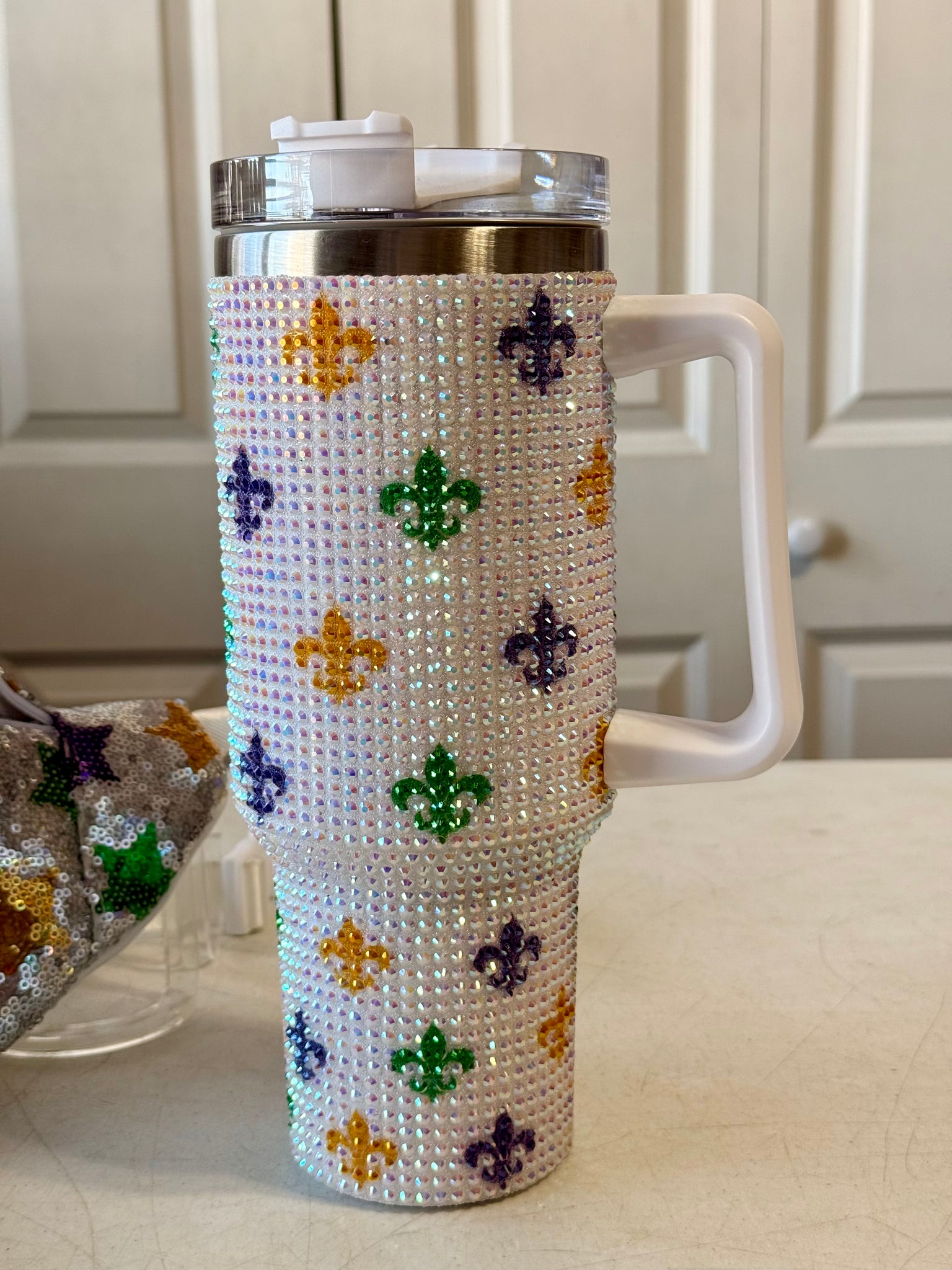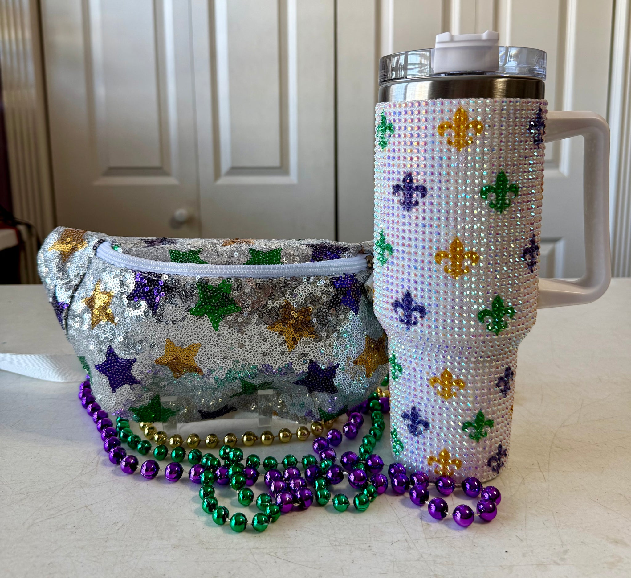 A festive, boutique-style trio made to shine all season long. This set features a tall insulated tumbler wrapped in iridescent rhinestones and colorful fleur-de-lis accents, paired with a matching sequined zip pouch covered in metallic stars. Finished off with classic purple, green, and gold bead strands, it’s equal parts fun and functional—perfect for parades, parties, or gifting a little Mardi Gras magic.