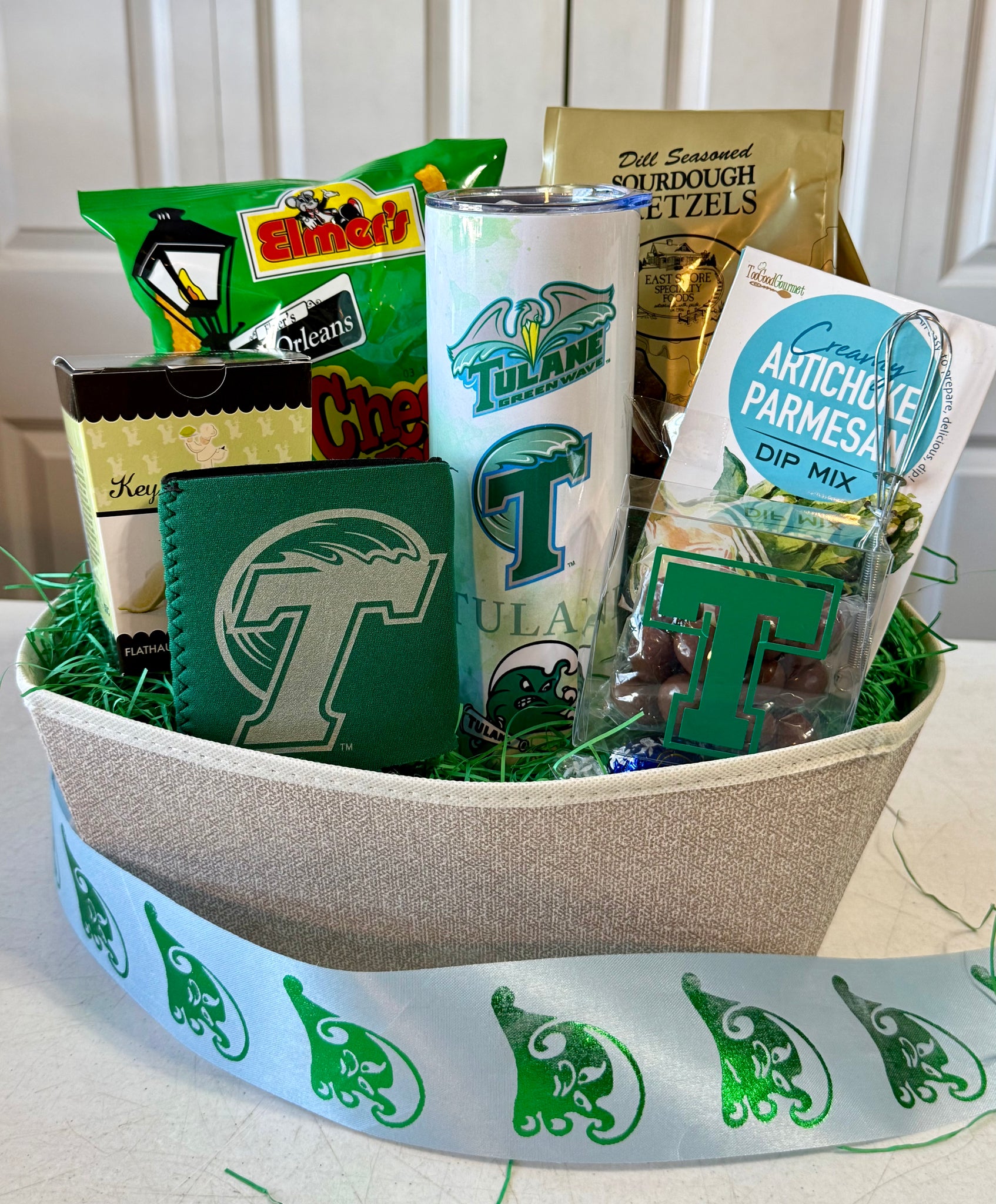 Fabric basket full of Tulane goodies. Sourdough pretzels, Tulane koozie, chocolate covered almonds, artichoke Parmesan dip mix, key lime cookies, Elmer’s New Orleans style Chee Wees, Insulated stainless steel 20oz. skinny tumbler. The tumbler has Tulane artwork! Ultimate gift for the Tulane fan.