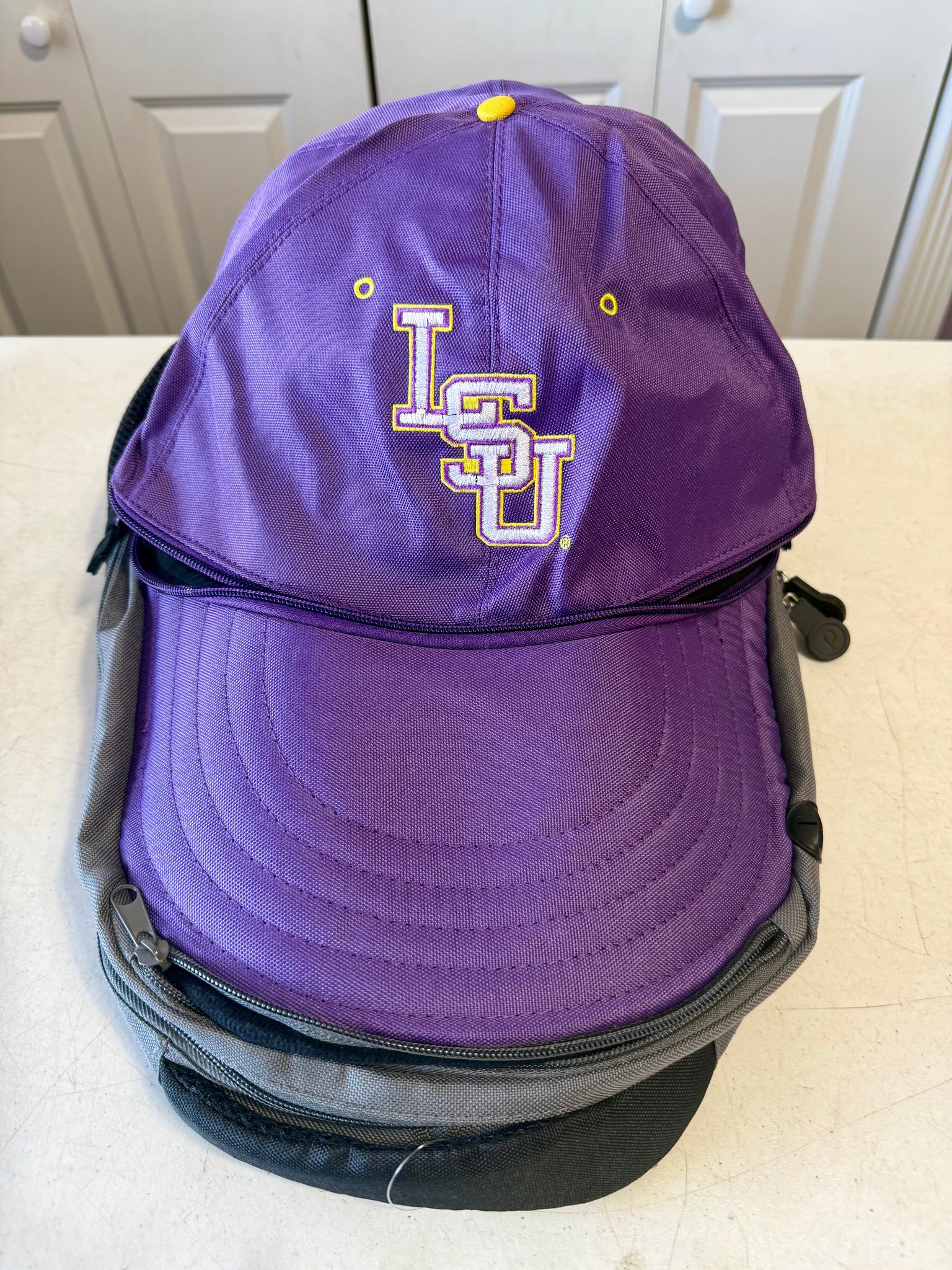 LSU student will love this LSU backpack that looks like a baseball cap. Expandable backpack full of snacks. Pretzels, popcorn, moon pie, zapps chips, Tiger cup, cookies, tin of nuts, LSU makeup kit, LSU koozie. Clear wrap with an LSU bow.