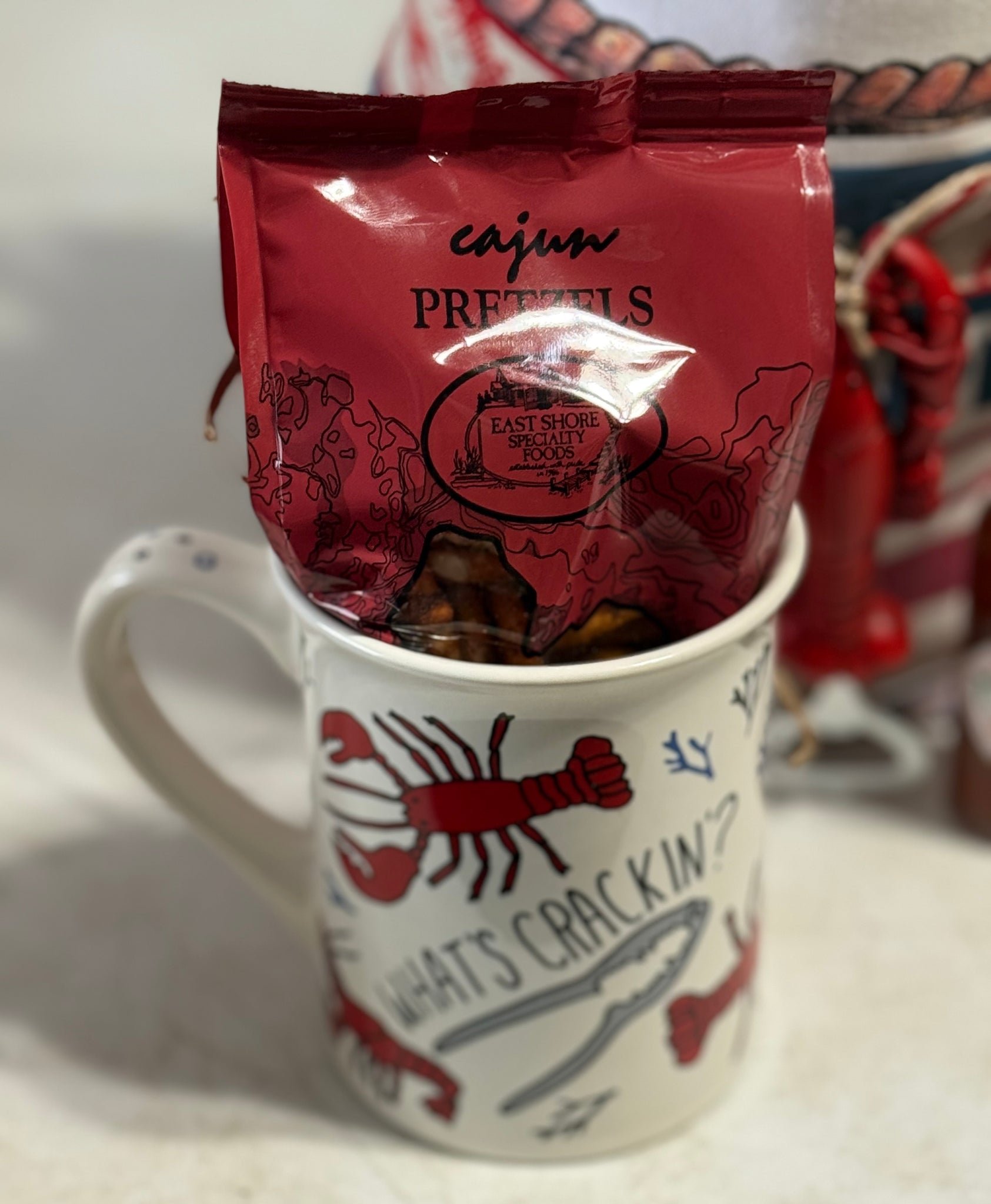 For your crawfish lover! Dish towel wrapped into a sack. Oh snap large crawfish mug, crawfish Zapps chips, small bottle of Tabasco sauce, Cajun pretzels, crawfish bottle opener, and seafood boil seasoning.